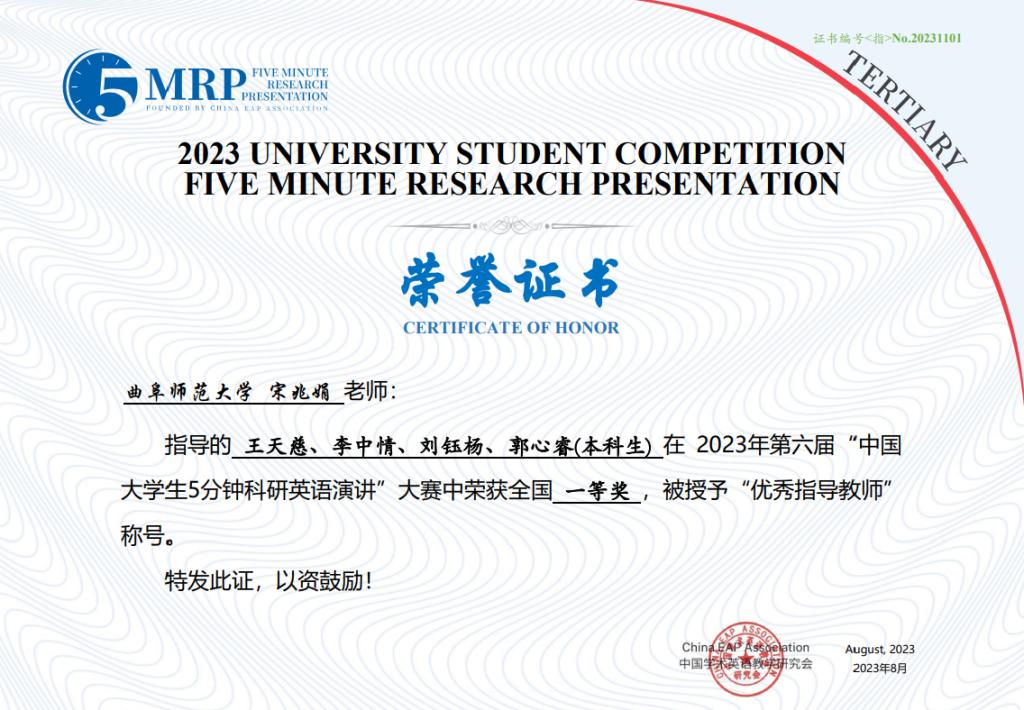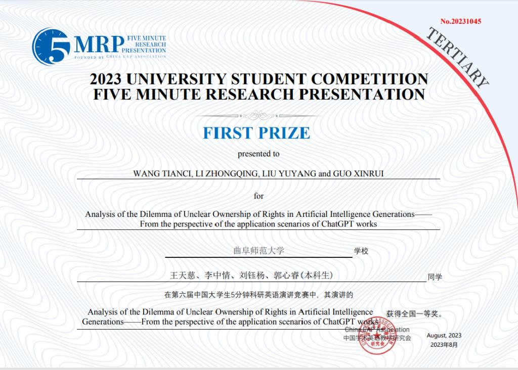日前,第六届中国大学生5分钟科研英语演讲竞赛决赛(非医科类)在同济大学成功举行。由江南在线注册选拔推荐的16支团队取得优异成绩,获得全国一等奖1项、二等奖6项、三等奖9项。其中,由王天慈、李中情、刘钰杨、郭心睿等四位同学组成的团队作品“Analysis of the Dilemma of Unclear Ownership of Rights in Artificial Intelligence Generations — From the perspective of the application scenarios of ChatGPT works”荣获全国一等奖。此外,其他16支参赛队伍分获校级一、二、三等奖。宋兆娟、李梦实等25位老师荣获优秀指导教师奖。
