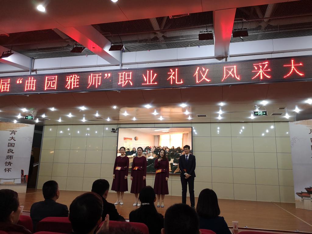 由我部蒋珊珊﹑门超元﹑张英﹑朱晓蒙四位教师组成的“仰望星空”战队,在 12月19日晚,我校举办首届“曲园雅师”职业礼仪风采大赛中,经过激烈角逐,荣获一等奖。本次大赛由学校工会、日照校区管理办公室、宣传部、教师工作部联合举办,日照校区13支优秀青年教师队伍同台竞技。