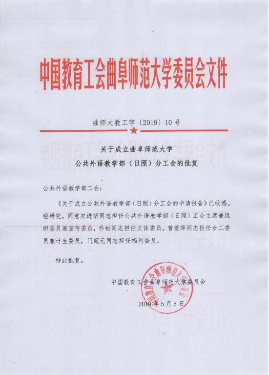 曲师大教工字〔2019〕10号关于成立江南在线注册江南(中国)(日照)分工会的批复