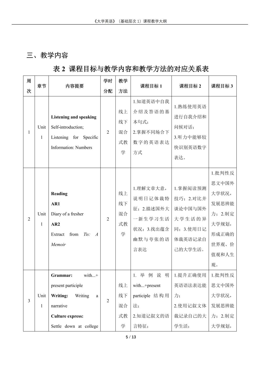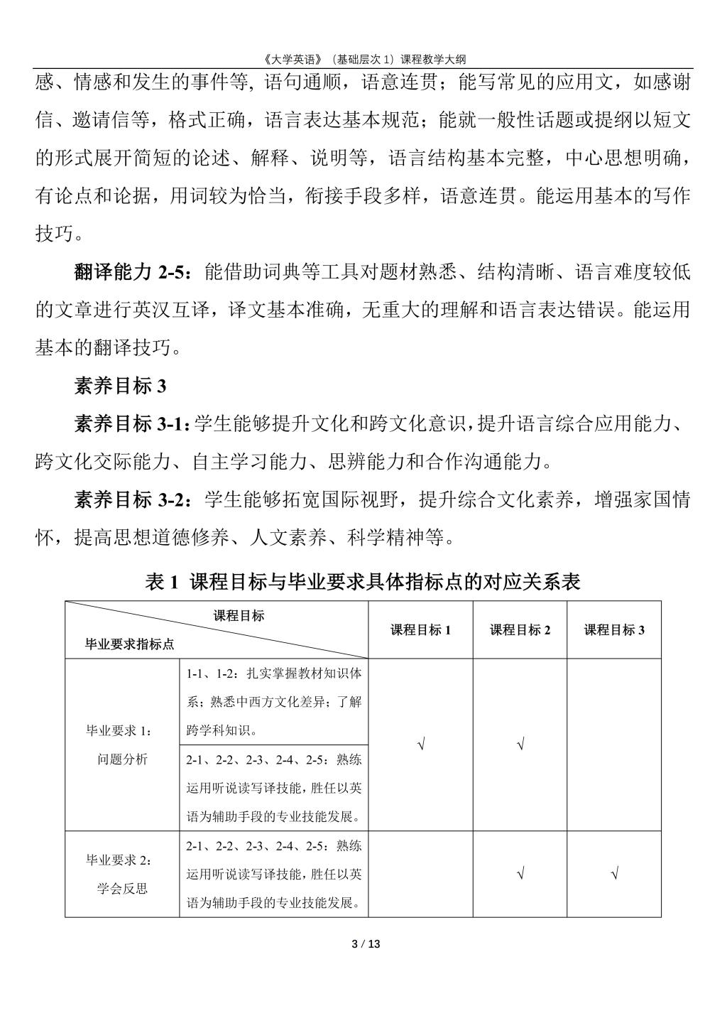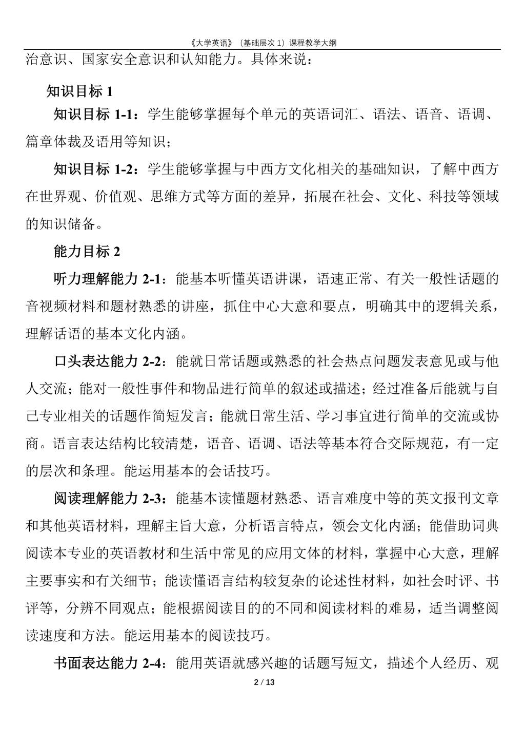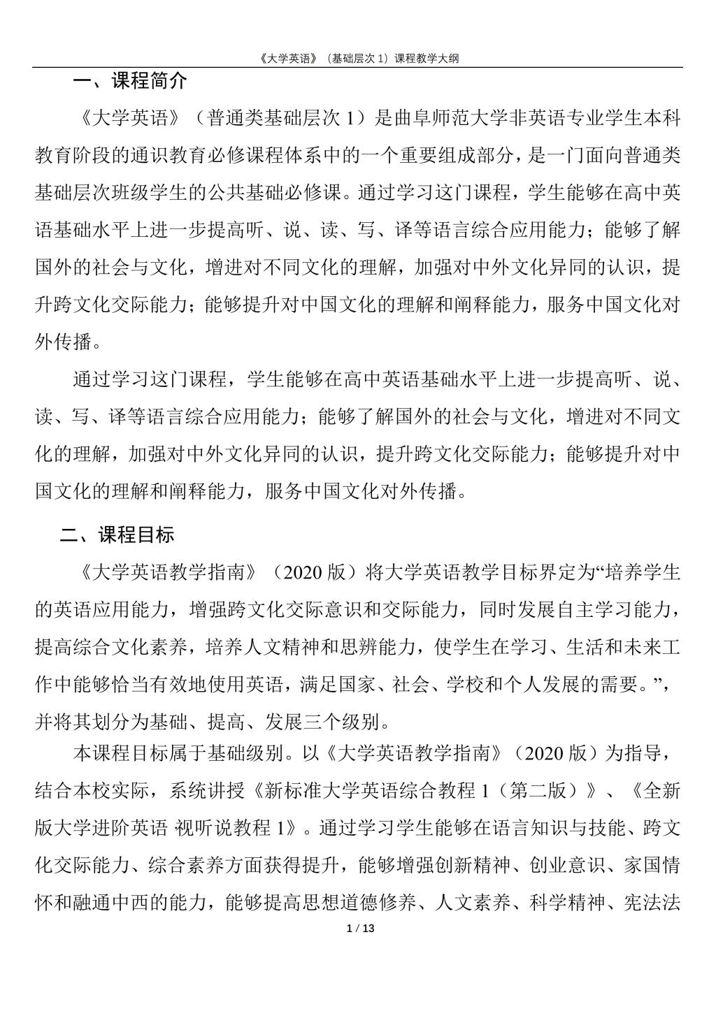 大学英语(普通类基础层次1)课程教学大纲(2022版)