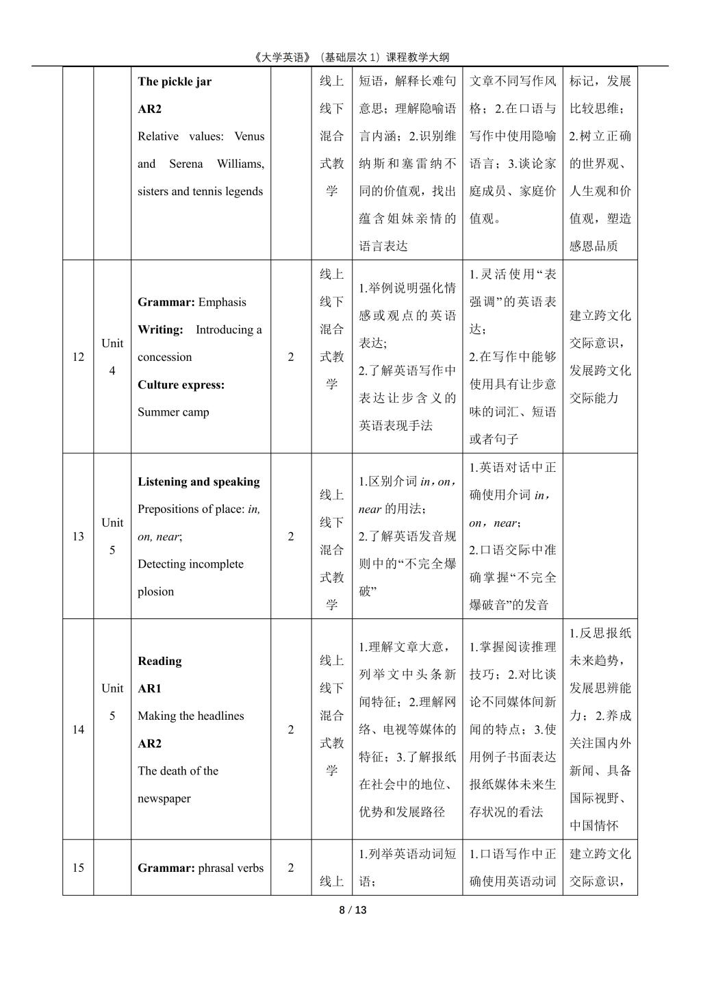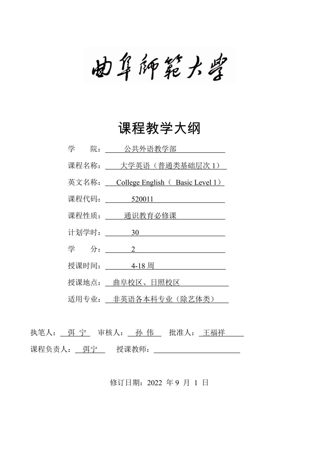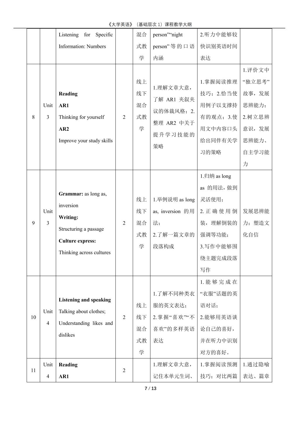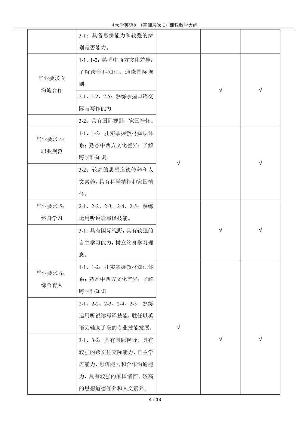 大学英语(普通类基础层次1)课程教学大纲(2022版)