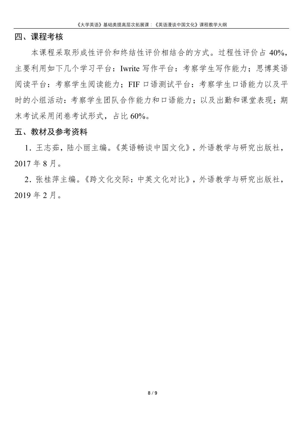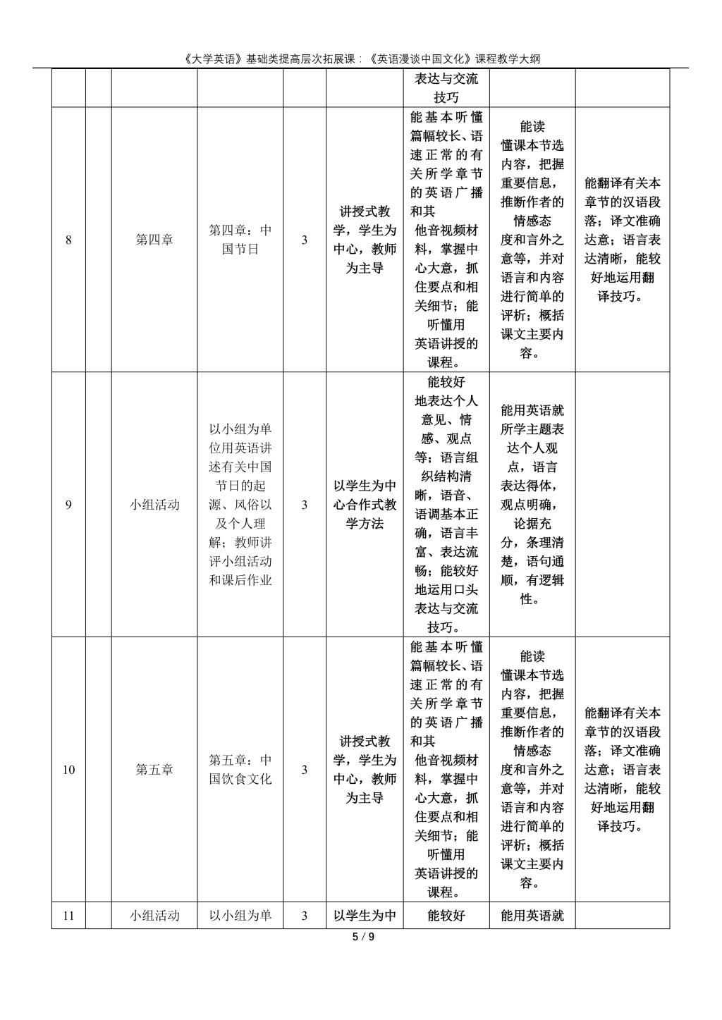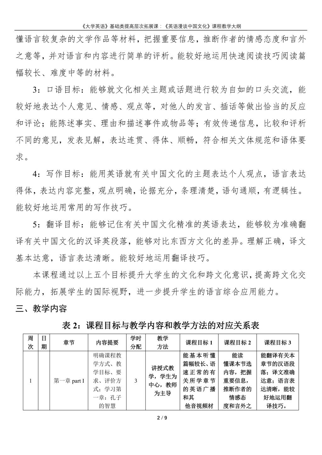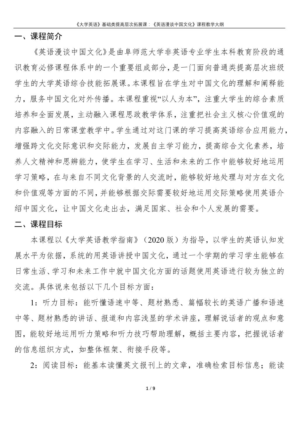 大学英语(普通类提高层次拓展课:《英语漫谈中国文化》)课程教学大纲(2022版)
