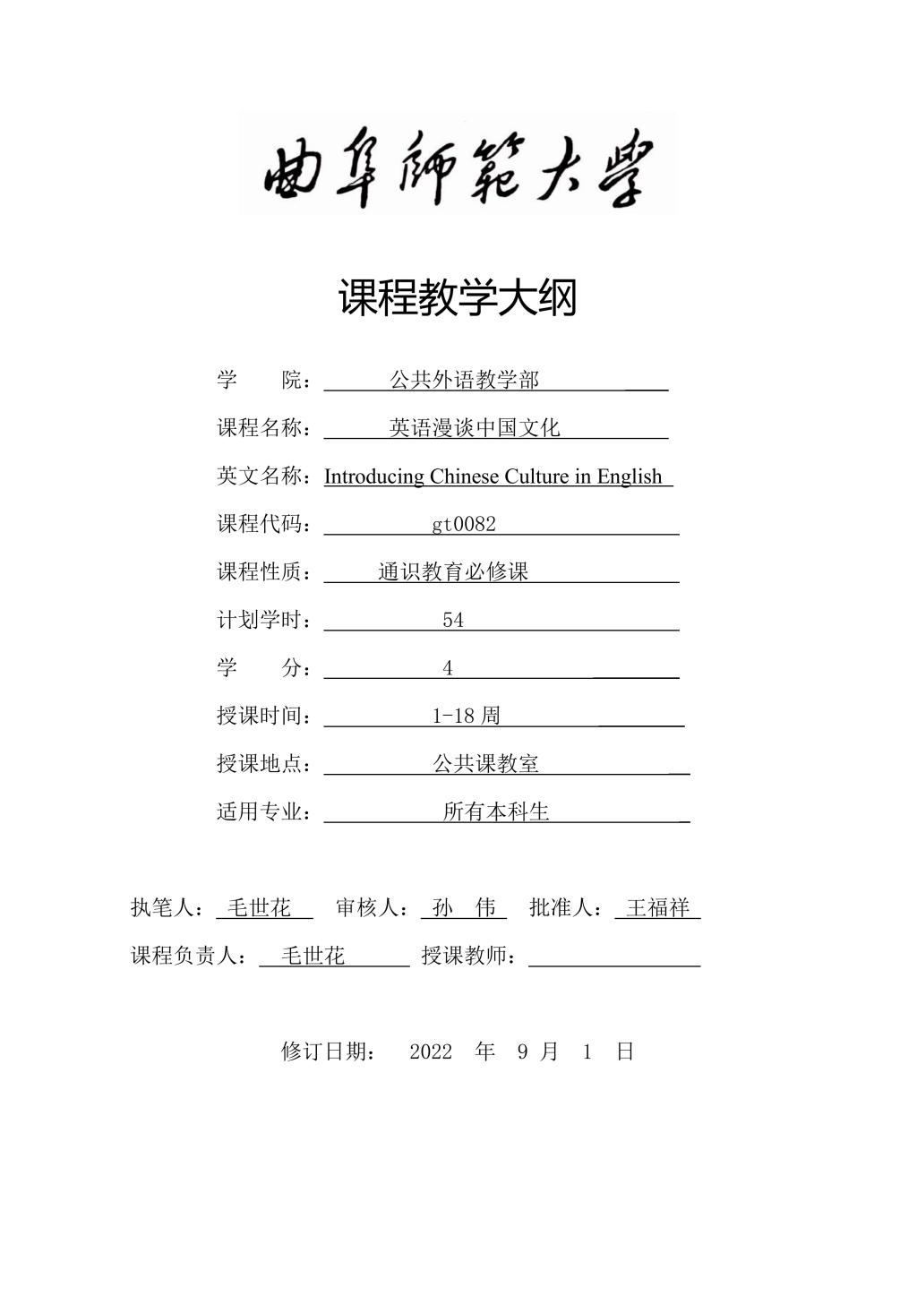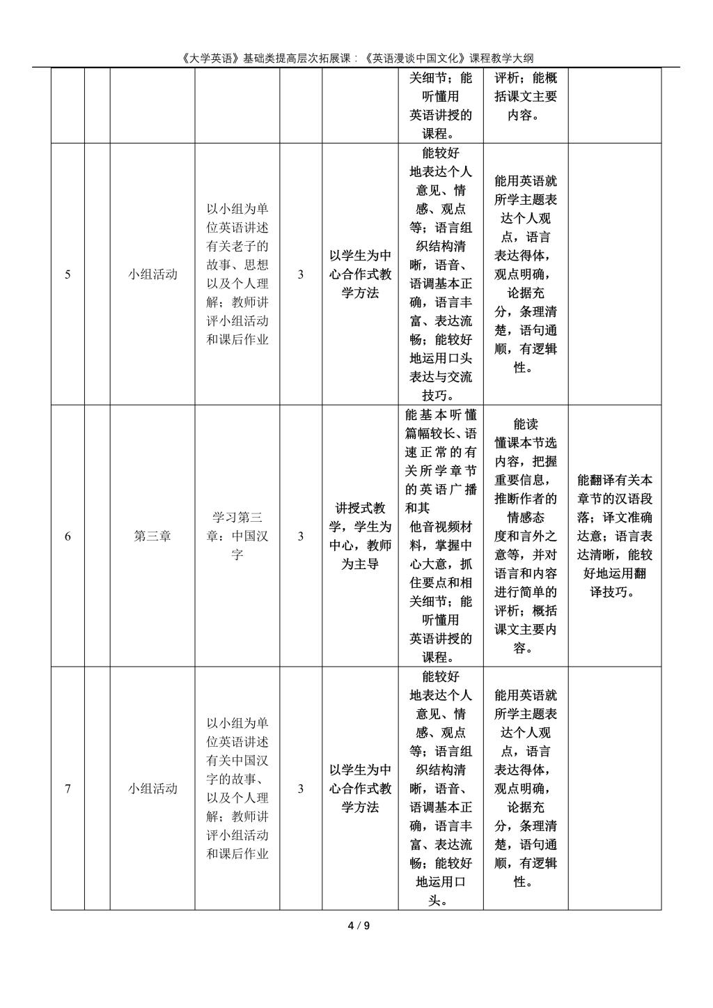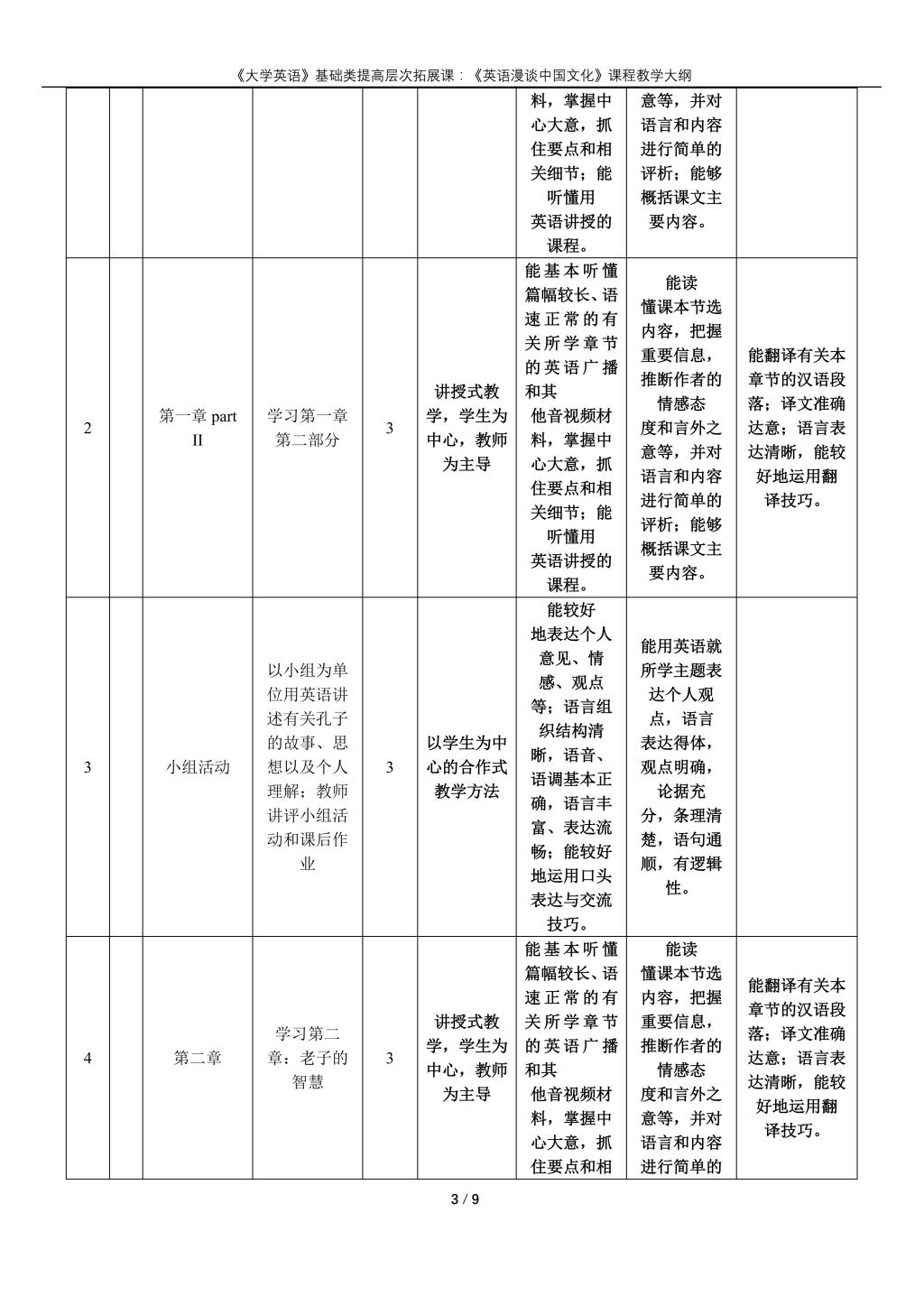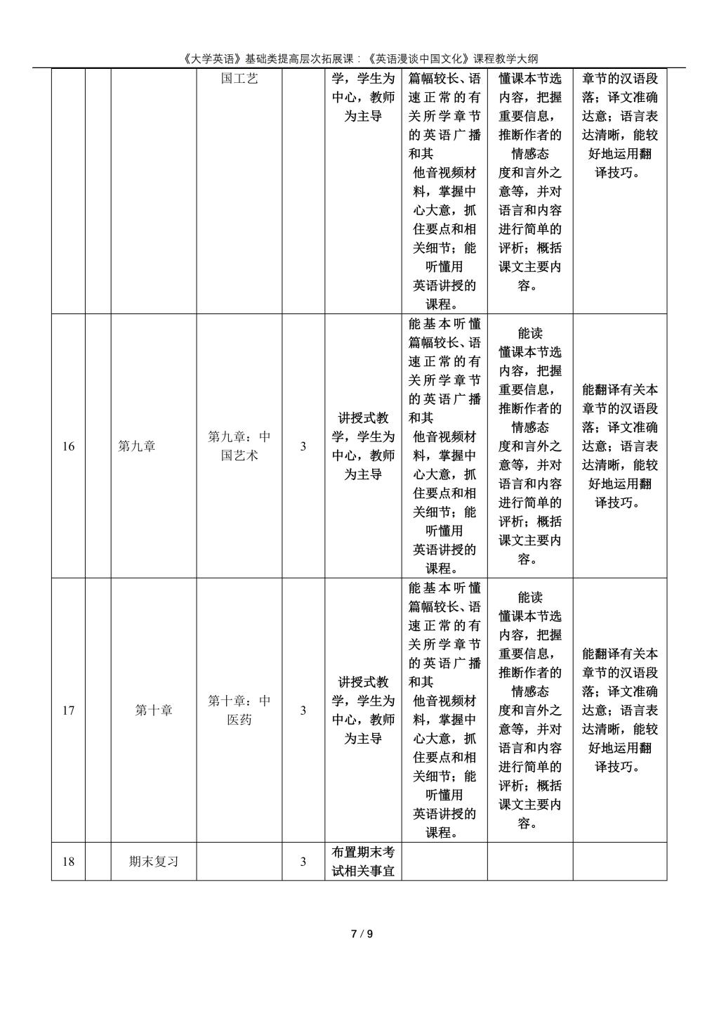 大学英语(普通类提高层次拓展课:《英语漫谈中国文化》)课程教学大纲(2022版)