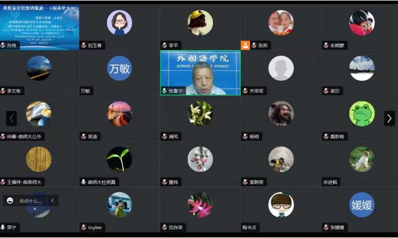 7月19日上午,江南(中国)邀请我校优秀校友、南京林业大学外国语学院副院长、张鲁宁教授作“大学英语一流课程建设”线上专家报告会。报告会由副主任孙伟主持,主任王福祥、各教研室主任、各课程建设团队负责人及其全体骨干成员参加。