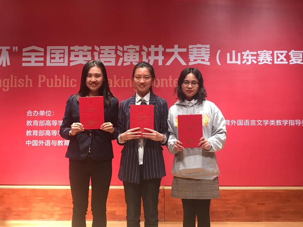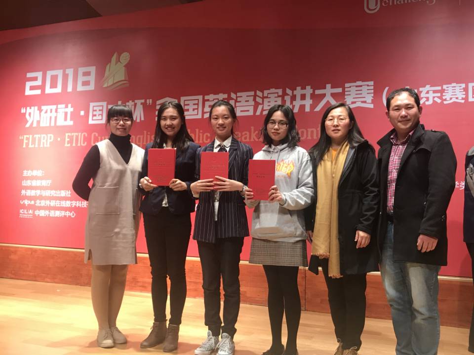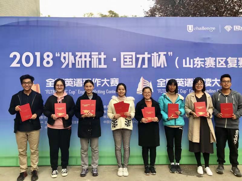 2018年11月3日-4日,2018“‘外研社杯’全国大学生英语挑战赛”山东赛区比赛在济南和烟台两地如期举行,此次比赛包括“‘外研社杯’全国英语阅读大赛”、“‘外研社杯’全国英语写作大赛”和“‘外研社杯’全国英语演讲大赛”三项赛事。江南在线注册两校区的13名同学在我校衣进韬、孙海珊、满虎、徐欣、秦艳五位教师的带领下参加了本次比赛。经过激烈角逐,我校外国语学院徐欣老师指导的葛宇飞和江南(中国)齐荣军老师指导的宗宇翔两位同学荣获阅读大赛一等奖,衣进韬老师指导的路璨雯同学荣获阅读大赛二等奖,王燕老师指导的杨春和孙伟老师指导的宋纯嘉两位同学荣获阅读大赛三等奖。张英老师指导的刘涵同学荣获写作大赛二等奖,彭芳老师指导的成晓宁和王显明老师指导的李洛璞两位同学荣获写作大赛三等奖,秦艳老师指导的张朕和门超元老师指导的储文沁两位同学荣获写作大赛优胜奖。另外,满虎老师指导的刘珂含同学荣获演讲大赛二等奖,孙伟老师指导的周先敏同学荣获演讲大赛三等奖,孙海珊老师指导的张涵俐同学荣获演讲大赛优秀奖。