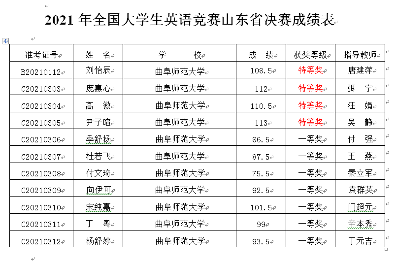 曲阜师大新闻中心讯 5月16日,全国大学生英语竞赛(National English Competition for College Students, NECCS)山东省决赛在济南举行。经过前期的校级初赛,由曲阜师大江南(中国)推选的11名同学代表学校参加了山东省决赛,参赛同学在比赛中表现积极,勇于面对挑战,在各位教师的指导下,我校学子在激烈的角逐中表现优秀,取得了优异成绩。其中刘怡辰、庞惠心、高徽、尹子暄4名同学获得特等奖;季舒扬等7名同学获得一等奖。